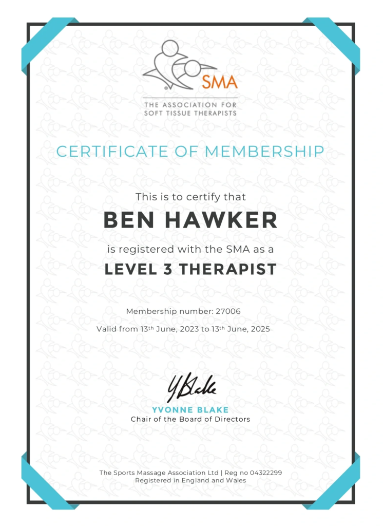 Proudly registered with the SMA as a Level 3 Therapist, upholding the highest standards of professionalism in sports therapy and continually enhancing expertise for exceptional client care. Grateful for SMA’s support.